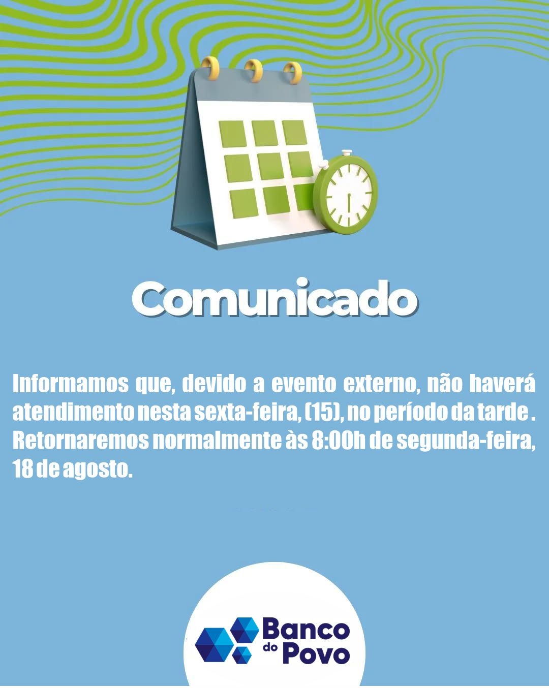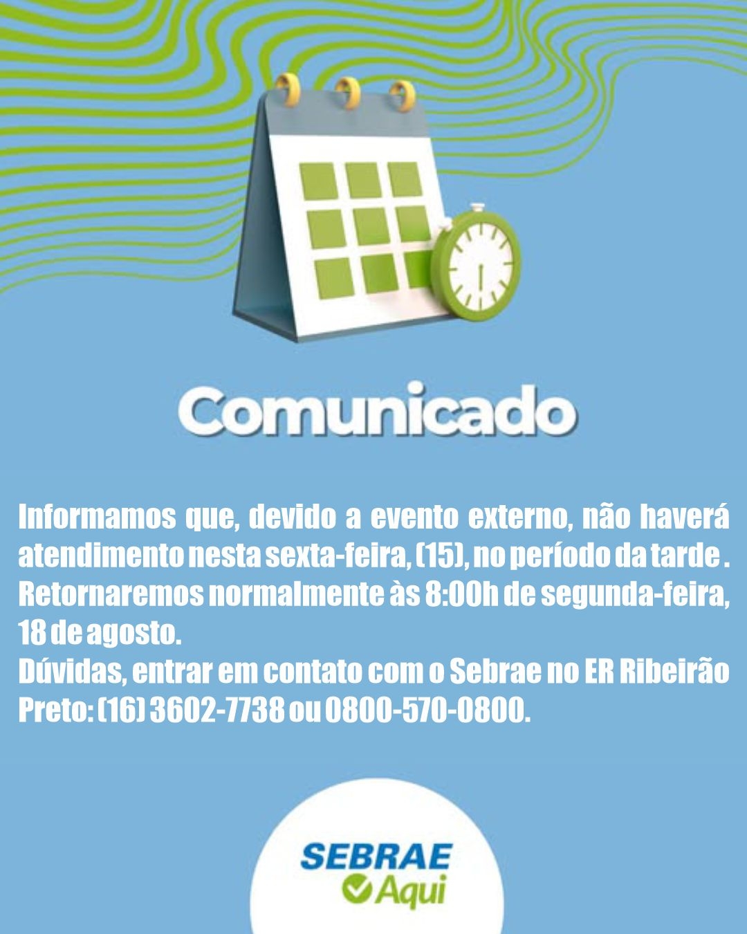 Informamos que nesta sexta-feira, (15/08), o Sebrae Aqui e o Banco do Povo não terão atendimento no período da tarde, devido evento externo.