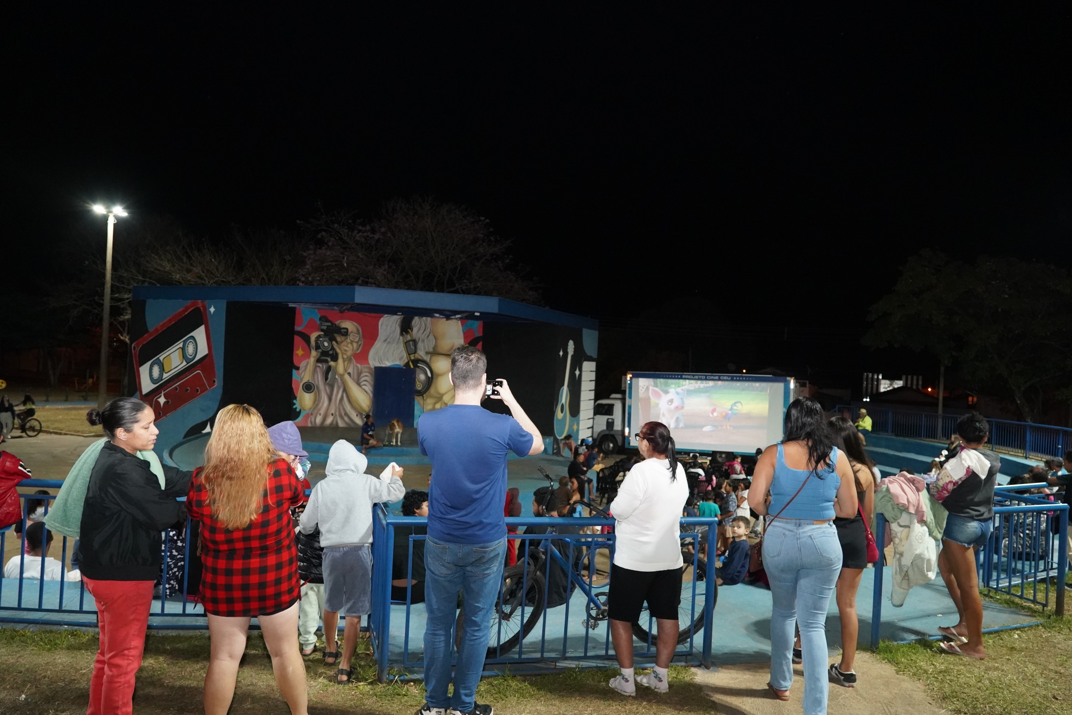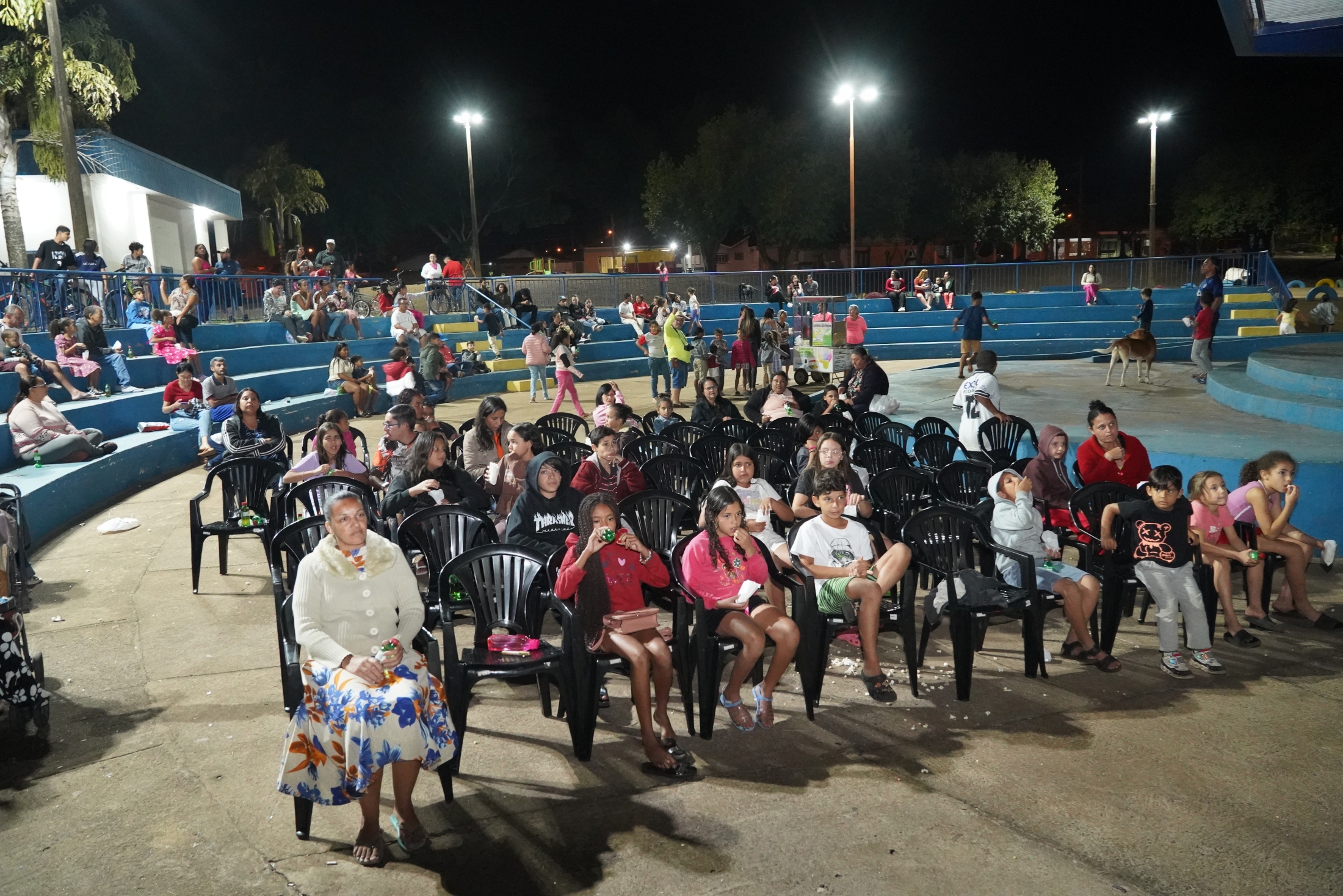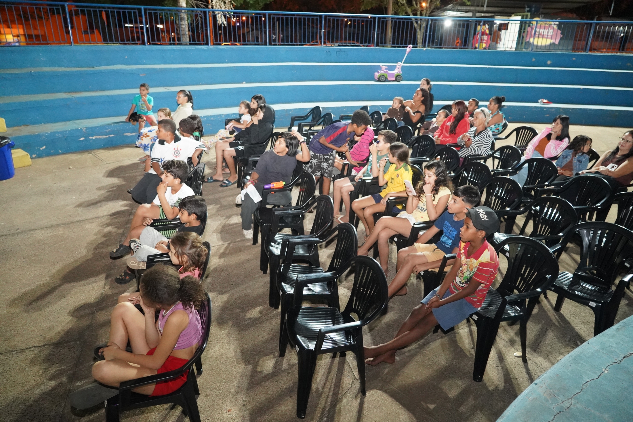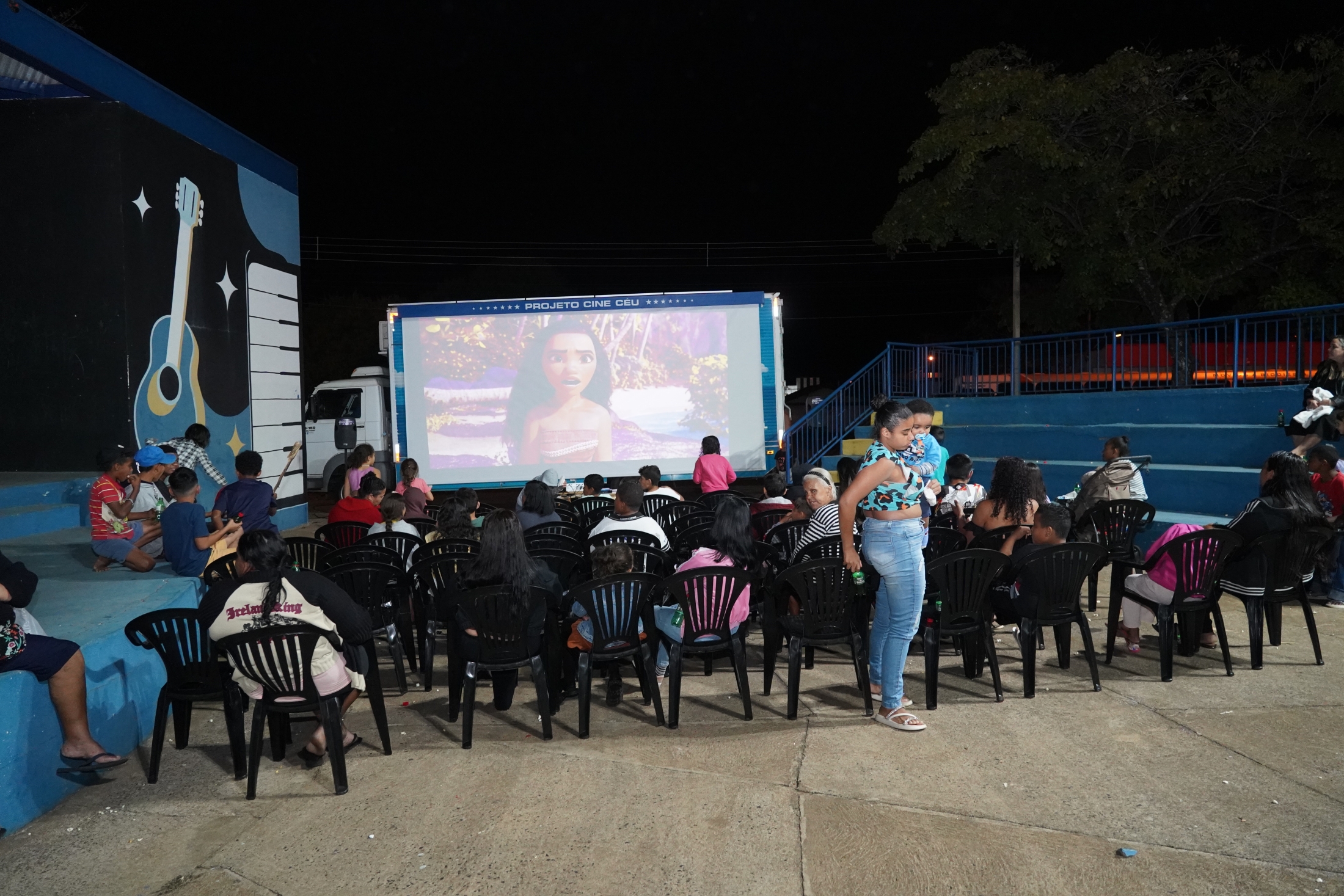 Na noite de ontem, sexta-feira (15), o anfiteatro Waldomiro Lima, na Praça Zuleika de Mello Moura Balbão, no bairro Nosso Teto, foi tomado por crianças, jovens e adultos que se reuniram para prestigiar a primeira sessão do Cine Céu: Cinema Itinerante Sustentável. Olhos atentos à telona, pipoca e refrigerante nas mãos e muitos sorrisos marcaram a exibição gratuita da animação “Moana – Um Mar de Aventuras”, que levou emoção e alegria a todos.