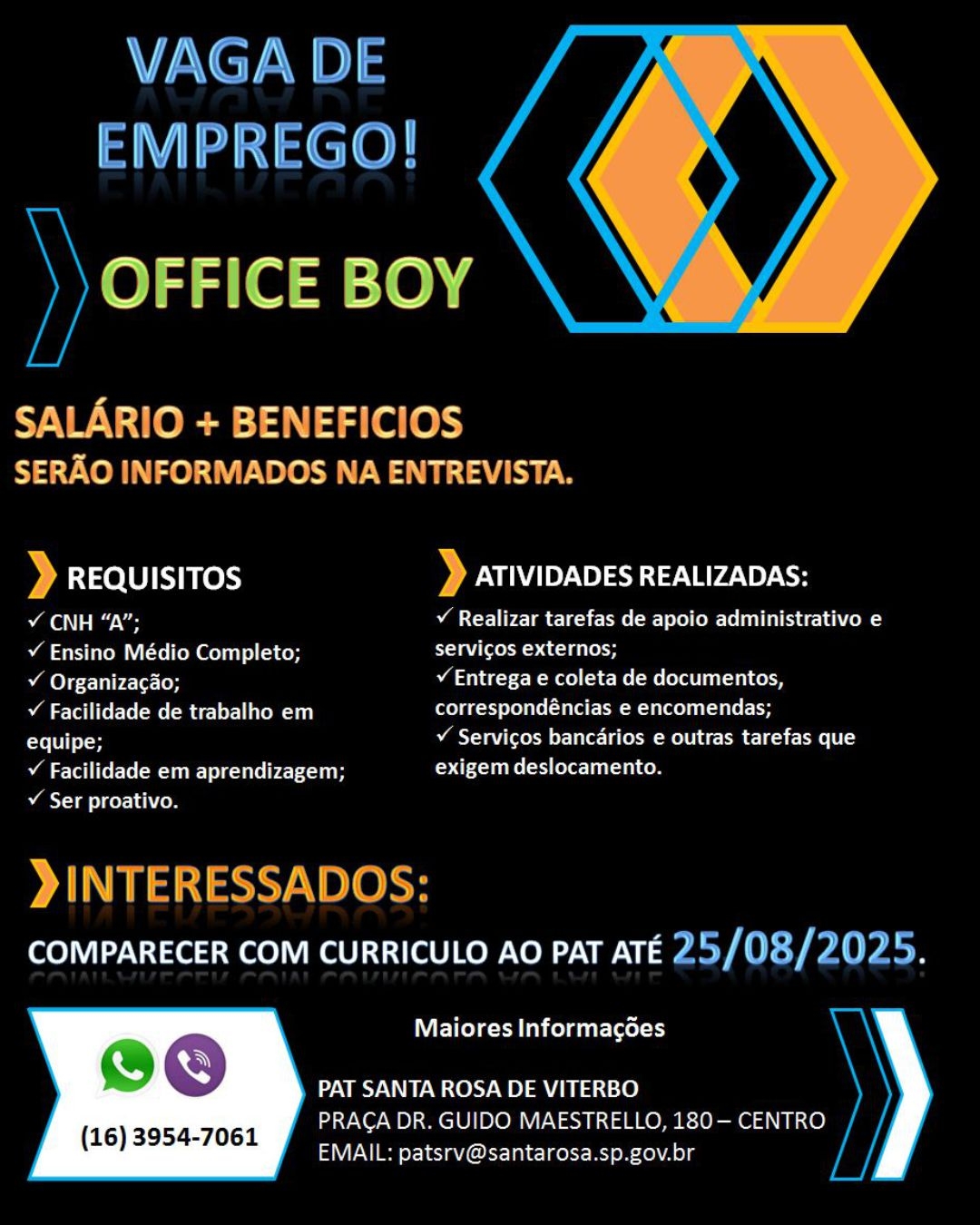 Vaga de emprego. Mais informações no PAT de Santa Rosa de Viterbo