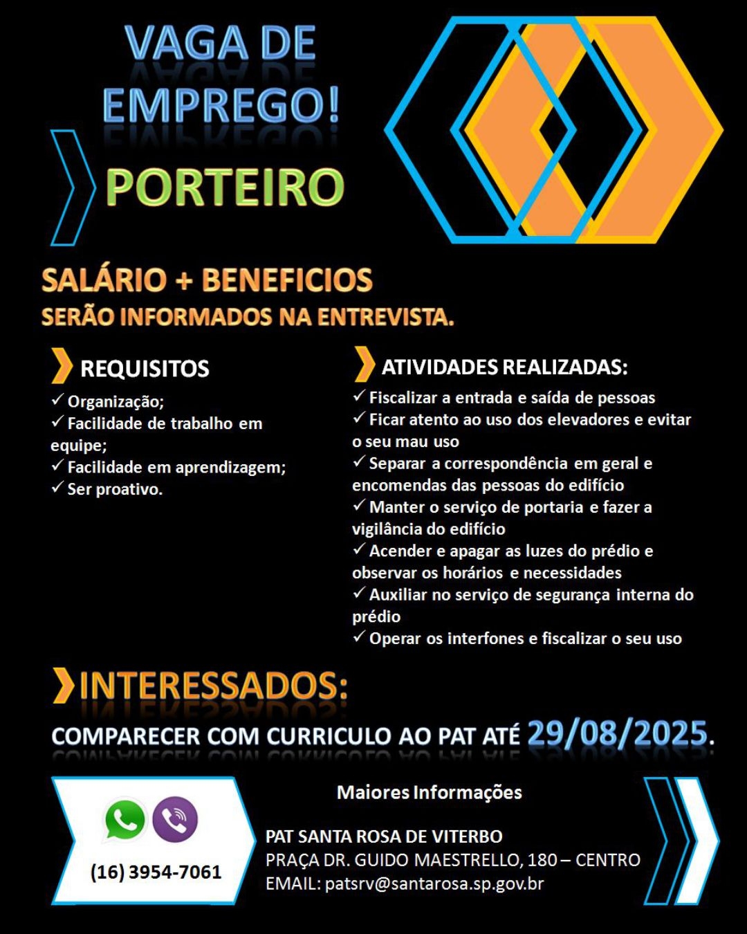 Vagas de emprego. Mais informações no PAT de Santa Rosa de Viterbo.