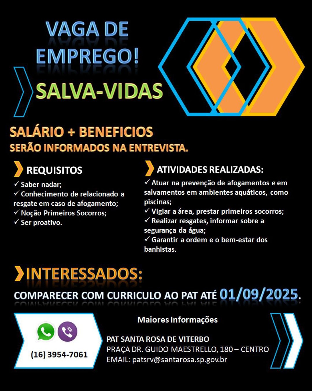 PAT de Santa Rosa de Viterbo tem vaga de emprego em aberto para salva-vidas