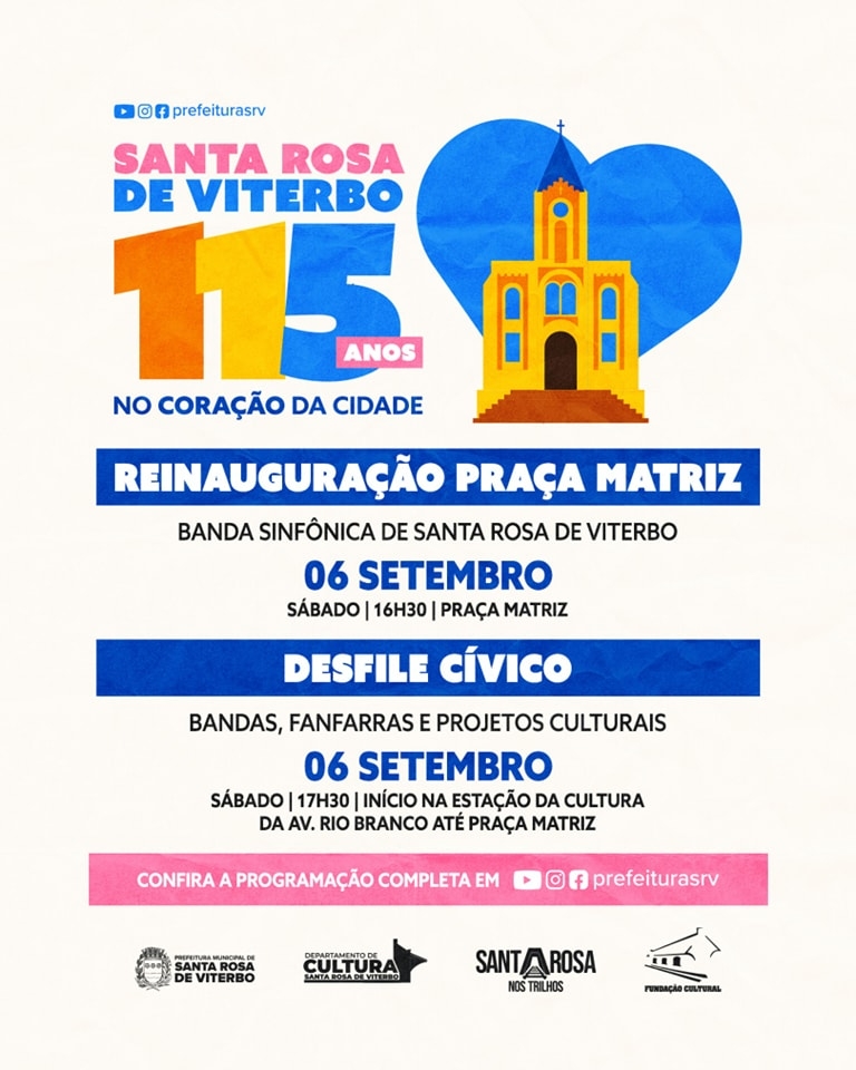 Atenção: o Desfile Comemorativo com bandas e fanfarras, o Ato Cívico, a Cerimônia de Reinauguração da Praça e apresentação da Banda Sinfônica continuam mantido na Praça Matriz, como originalmente programado.