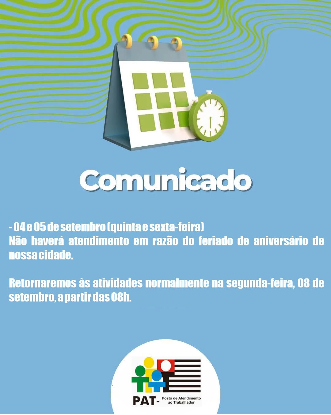 Não haverá atendimento devido ao feriado de aniversário de nossa cidade.