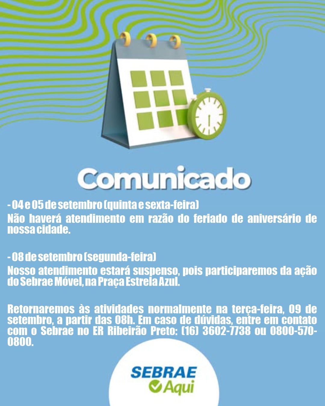 Atendimento suspenso. Nossa equipe estará participando da ação do Sebrae Móvel, na Praça Estrela Azul.