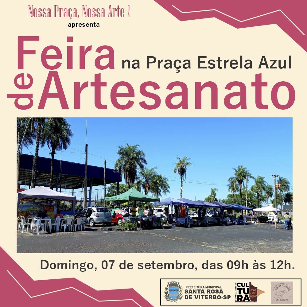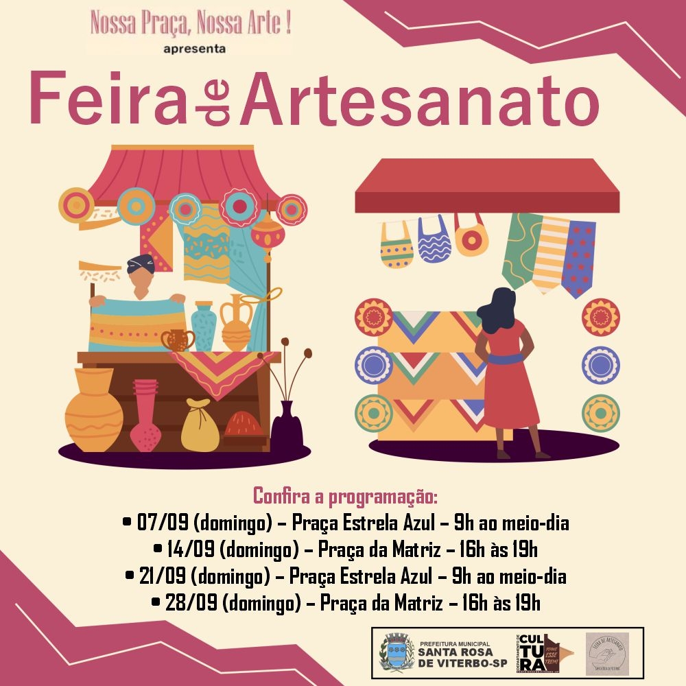 O Departamento de Cultura informa o calendário das Feiras de Artesanato que acontecerão no mês de setembro em Santa Rosa de Viterbo. Os eventos reúnem artistas e artesãos locais, valorizando o trabalho manual e oferecendo ao público a oportunidade de prestigiar e adquirir peças exclusivas.