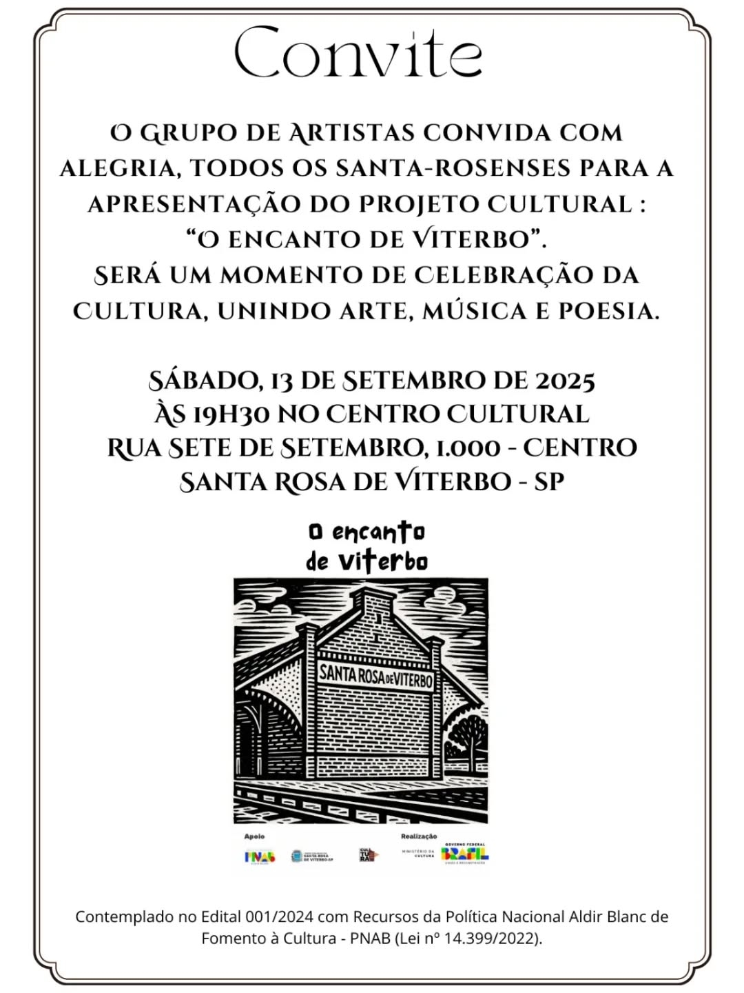 No próximo sábado, 13 de setembro, às 19h30, o Centro Cultural será palco da apresentação musical “O Encanto de Viterbo”. O projeto, que celebra a cultura em suas diversas formas, trará ao público a arte visual, a música e a literatura de cordel, narrando as origens da história de nossa cidade e destacando momentos importantes que contribuíram para o surgimento e povoamento de Santa Rosa de Viterbo.