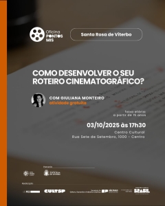 O Departamento de Cultura da Prefeitura de Santa Rosa de Viterbo, em parceria com o Ponto MIS, abre inscrições para a oficina "Como desenvolver o seu roteiro cinematográfico?", que será realizada no dia 3 de outubro, às 17h30, no Centro Cultural do município.