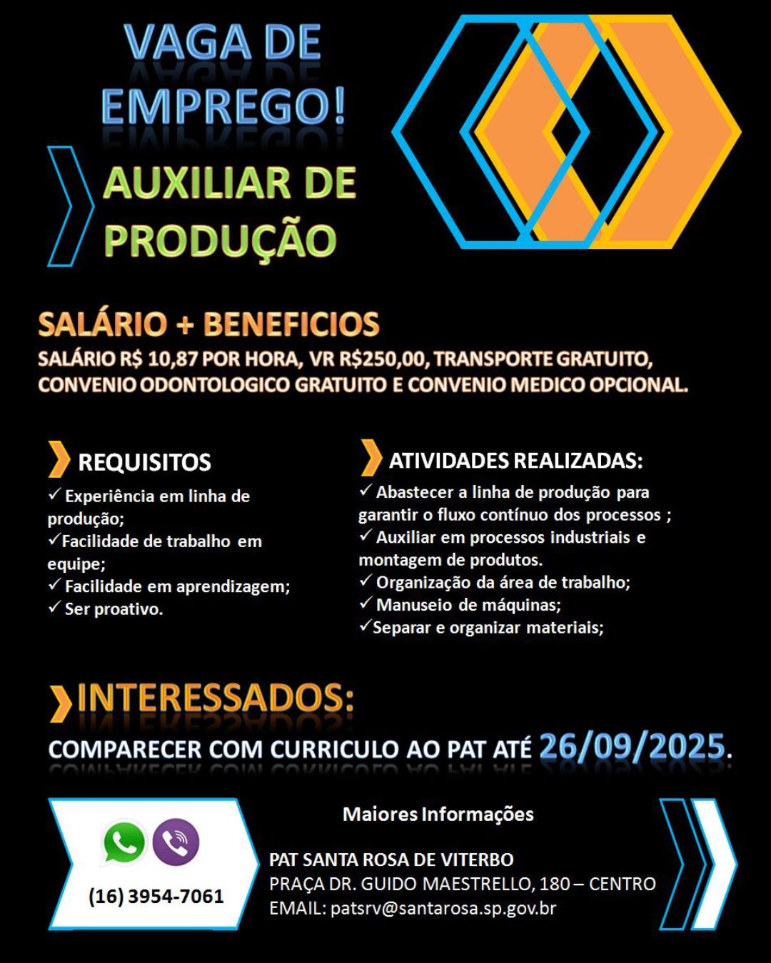 PAT de Santa Rosa de Viterbo tem vaga em aberto para auxiliar de produção