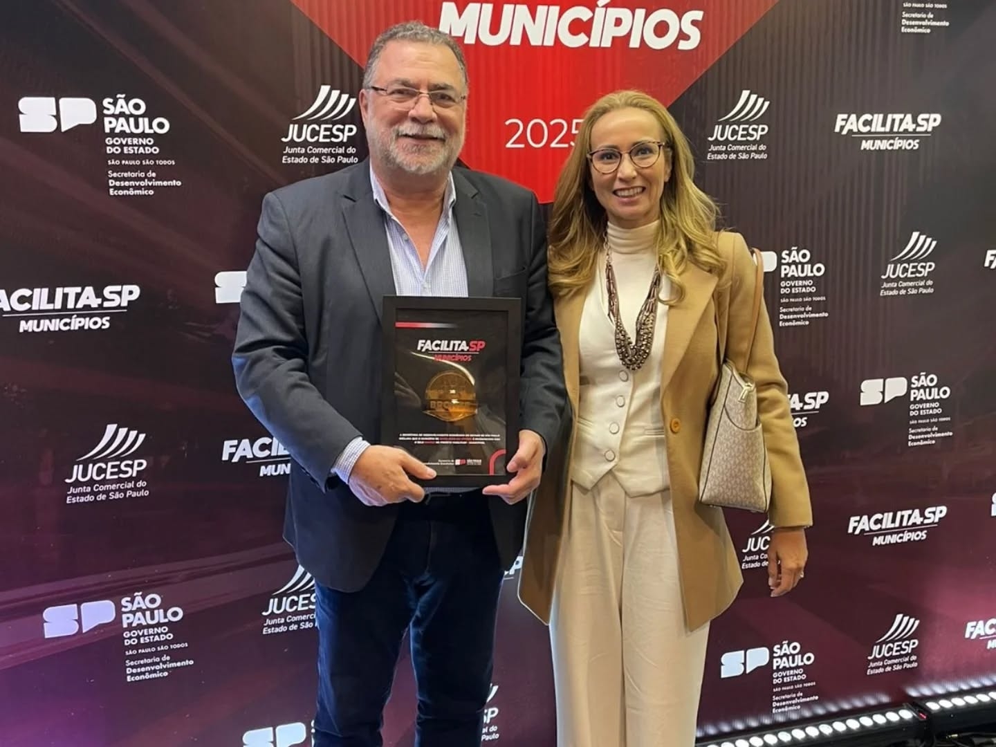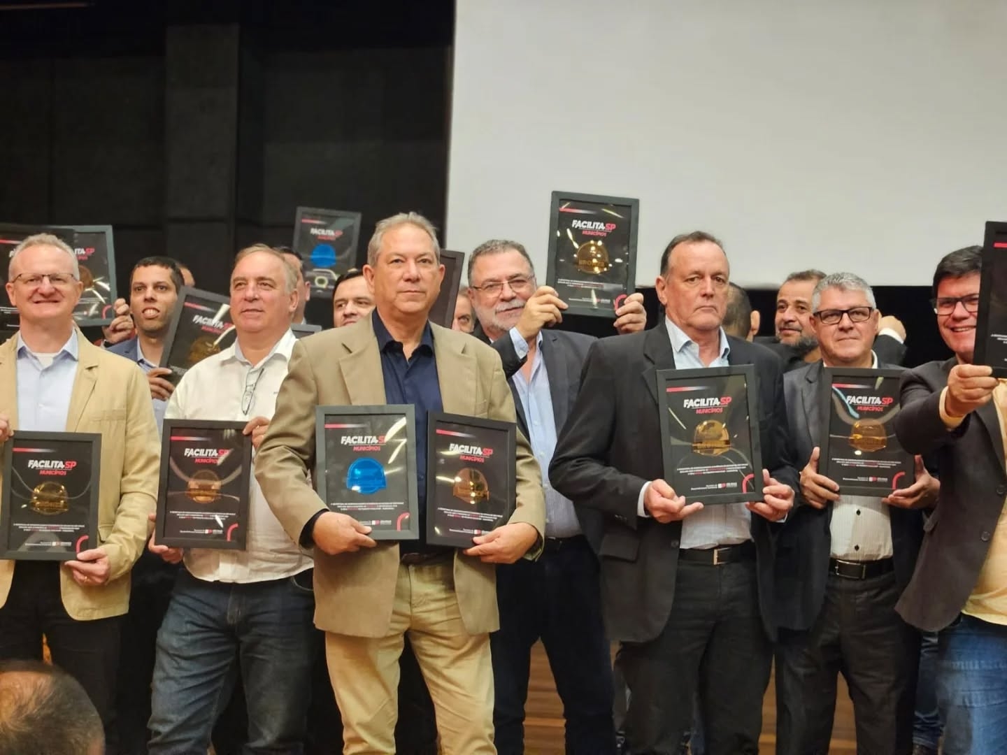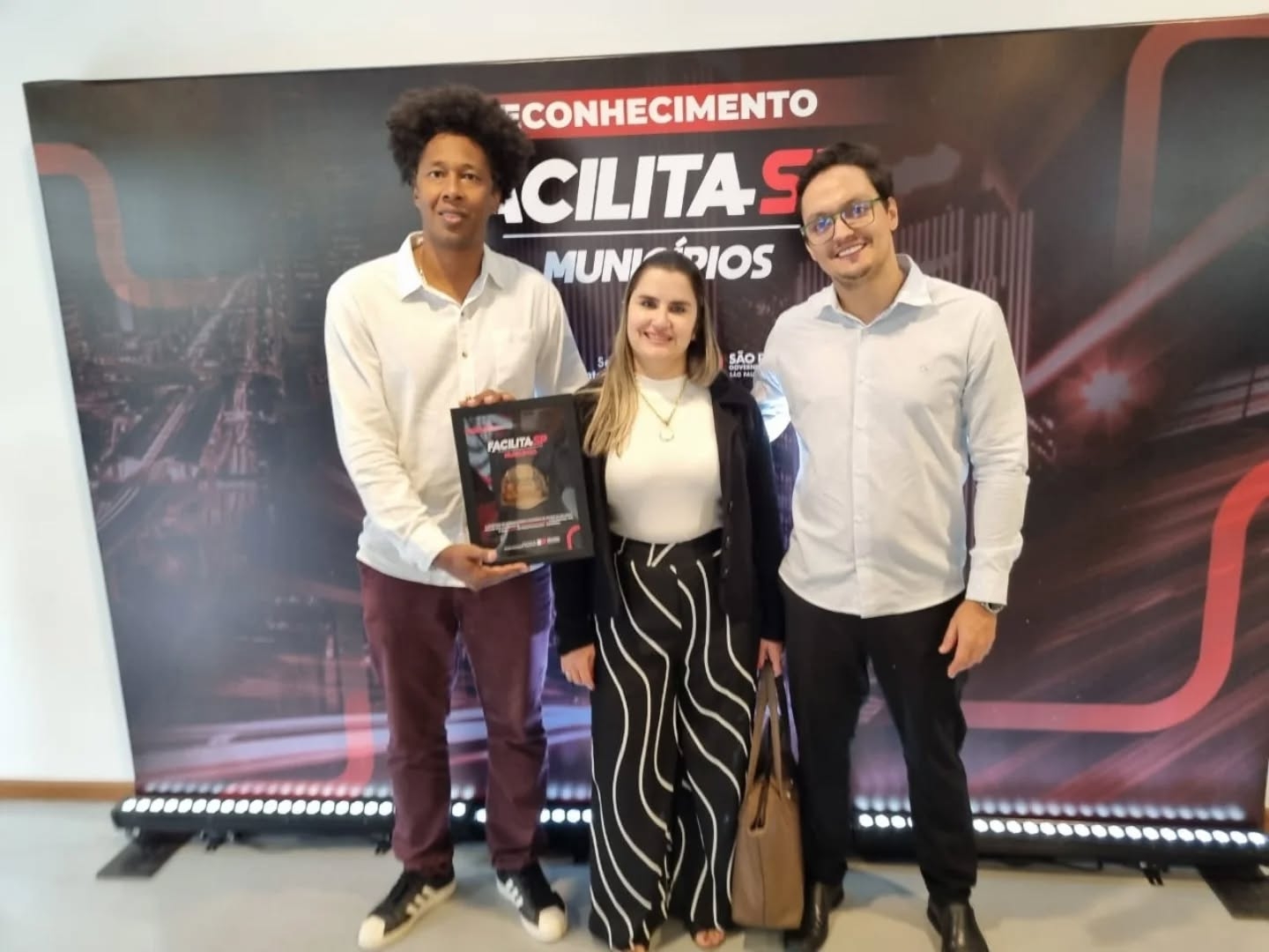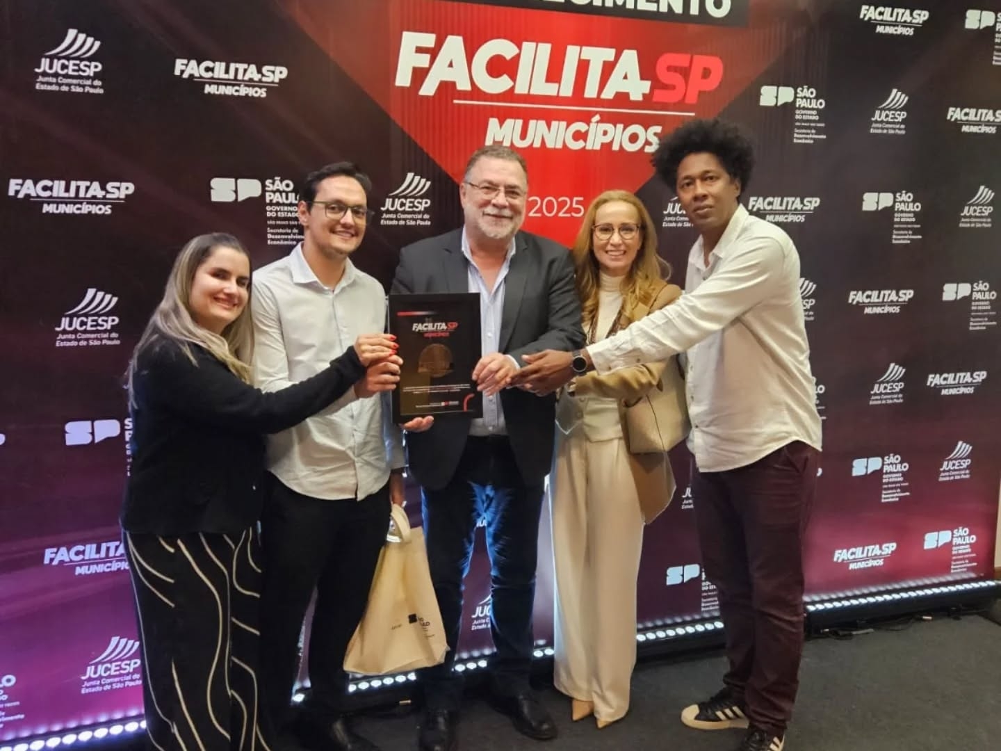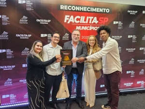 Ontem, em São Paulo, o prefeito Omar Nagib Moussa, acompanhado de Romualdo Vinicius Ferreira Rosa, chefe do Setor de Desenvolvimento Econômico, Rodrigo Wiezel Beloti, do Departamento de Obras e Serviços Públicos, e Natália Formagio Fernandes, do Setor de Tributação, recebeu o Selo Bronze, em reconhecimento ao avanço do programa Facilita SP, que vem transformando o ambiente de negócios na cidade.