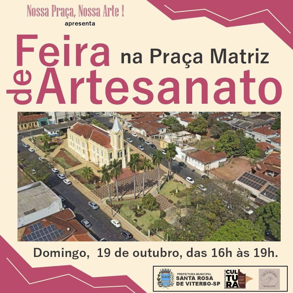 Prepare-se para uma tarde cheia de cores, talento e criatividade! O Departamento de Cultura convida você e sua família para prestigiar a Feira de Artesanato, neste domingo, 19 de outubro, das 16h às 19h, na Praça Dr. Guido Maestrello (Praça Matriz), em Santa Rosa de Viterbo.