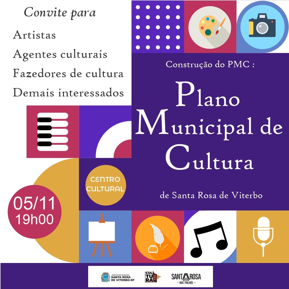 A Prefeitura Municipal de Santa Rosa de Viterbo, por meio do Departamento de Cultura, convida todos os artistas, agentes culturais, fazedores de cultura e demais interessados do município para participarem da reunião de construção do Plano Municipal de Cultura, que acontecerá no dia 05 de novembro de 2025, às 19h, no Centro Cultural.