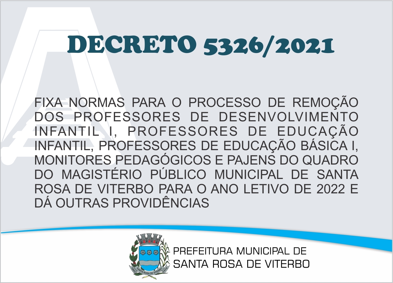 FIXA NORMAS PARA O PROCESSO DE REMOÇÃO DOS PROFESSORES DE DESENVOLVIMENTO INFANTIL I, PROFESSORES DE EDUCAÇÃO INFANTIL, PROFESSORES DE EDUCAÇÃO BÁSICA I, MONITORES PEDAGÓGICOS E PAJENS DO QUADRO DO MAGISTÉRIO PÚBLICO MUNICIPAL DE SANTA ROSA DE VITERBO PARA O ANO LETIVO DE 2022 E DÁ OUTRAS PROVIDÊNCIAS.