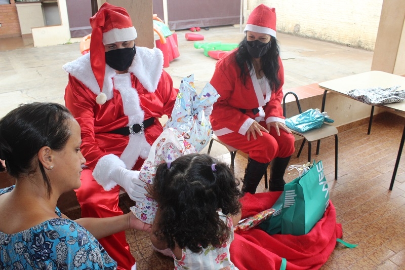 As “mamães noelas” entregaram os presentes e sacolinhas com doces a todos, que ansiosos, abriam os pacotes e mostravam as novas aquisições aos colegas. “Conseguimos as doações com amigos e empresários da cidade. Falamos o nome e tamanhos que as crianças usam e os “padrinhos” providenciam os presentes”, contou Roberta, agradecendo a todas as doações.