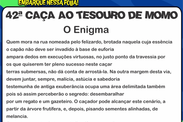 42ª Caça ao Tesouro de Momo: Enigma sai sábado, às 12h00