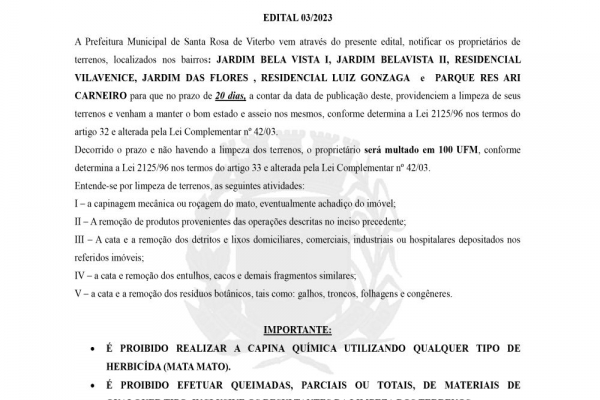 Setor de Posturas alerta para fim do prazo do EDITAL 03/2023, de limpeza de terrenos