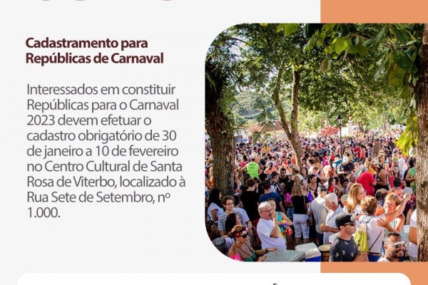 Cadastramento para Repúblicas de Carnaval Interessados em constituir Repúblicas para o Carnaval 2023 devem efetuar o ca