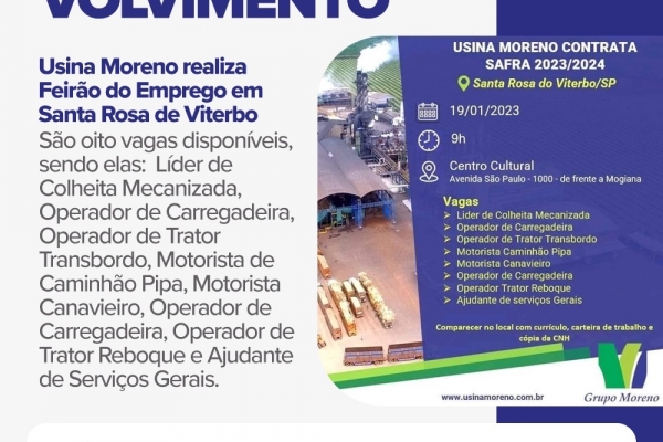 Usina Moreno realizará Feirão do Emprego em Santa Rosa de Viterbo