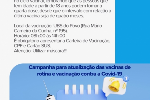 Neste sábado tem Campanha para atualização das vacinas de rotina e vacinação contra a Covid-19
