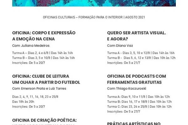 Secretária da Cultura e Poiesis divulgam calendário de oficinas culturais