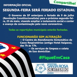 É importante lembrarmos que a razão da antecipação desse feriado não é para sairmos às ruas, nem para fazermos encontros de amigos ou festas... é por um motivo muito sério, de saúde pública, para tentarmos conter a propagação do novo coronavírus.