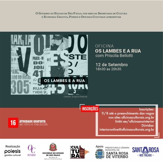 Esta oficina apontará a presença dos lambes na paisagem urbana e seu uso e apropriação por artistas e experimentadores. Um perambular atento aos lambes, suas mensagens, sua estética, suas características gráficas, suas potencialidades artísticas e sua presença na paisagem urbana. Trabalhos e ideias que sugerem uma mudança na percepção da rua como espaço compartilhado, e também inspiram à experimentação gráfica.