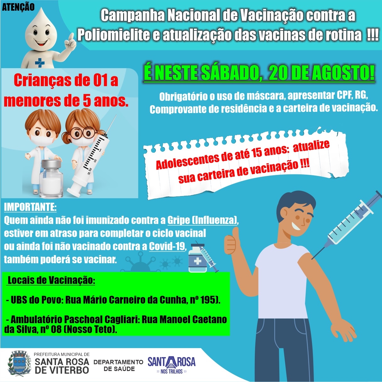A Diretoria de Saúde comunica que neste sábado, 20 de agosto, estará realizando a Campanha Nacional de Vacinação contra a Poliomielite para crianças de 01 a menores de 5 anos.