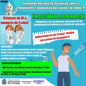A Diretoria de Saúde comunica que neste sábado, 20 de agosto, estará realizando a Campanha Nacional de Vacinação contra a Poliomielite para crianças de 01 a menores de 5 anos.