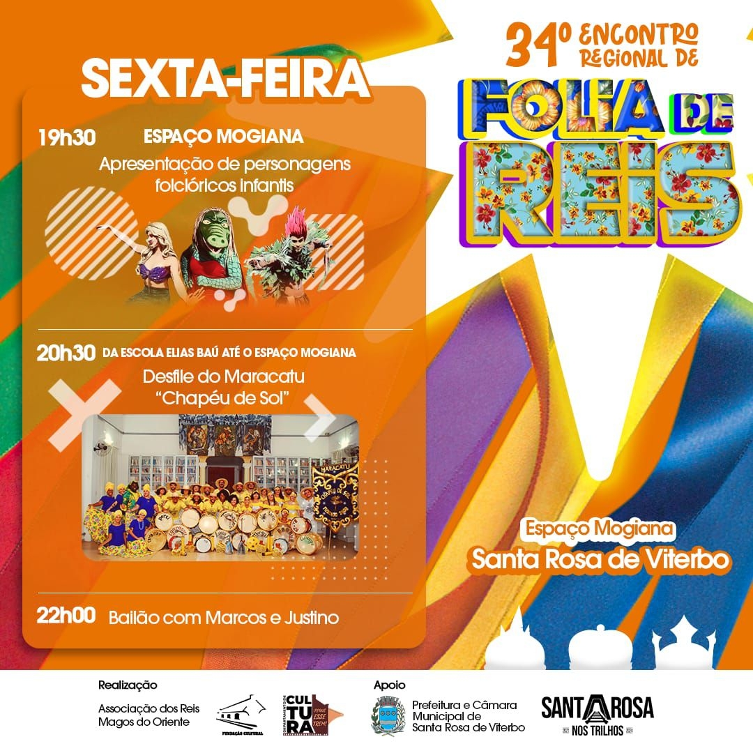 A sexta-feira está recheada de atrações para as crianças e adultos se divertirem no 34º Encontro Regional de Folias de Reis, em Santa Rosa de Viterbo.