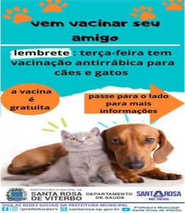 Amanhã, terça-feira, 30, haverá Vacinação antirrábica para cães e gatos.
