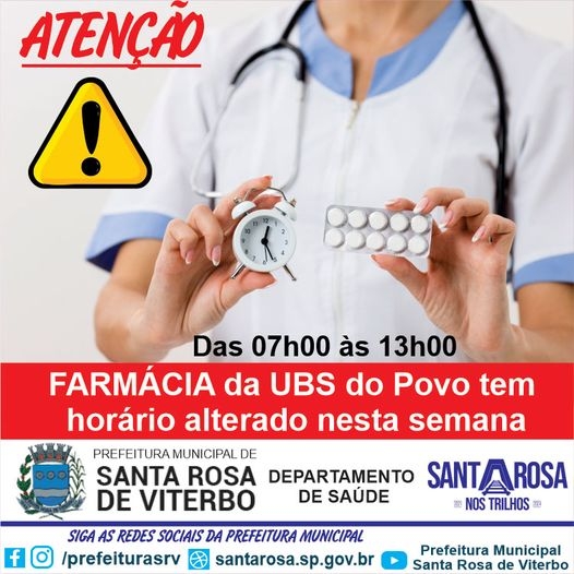 A Prefeitura Municipal de Santa Rosa de Viterbo, através da Diretoria Municipal de Saúde, informa que a Farmácia da UBS do Povo, localizada à Rua Doutor Mário Carneiro da Cunha, 195, por motivo de força maior funcionará somente no período da manhã nesta semana, das 07h00 às 13h00.