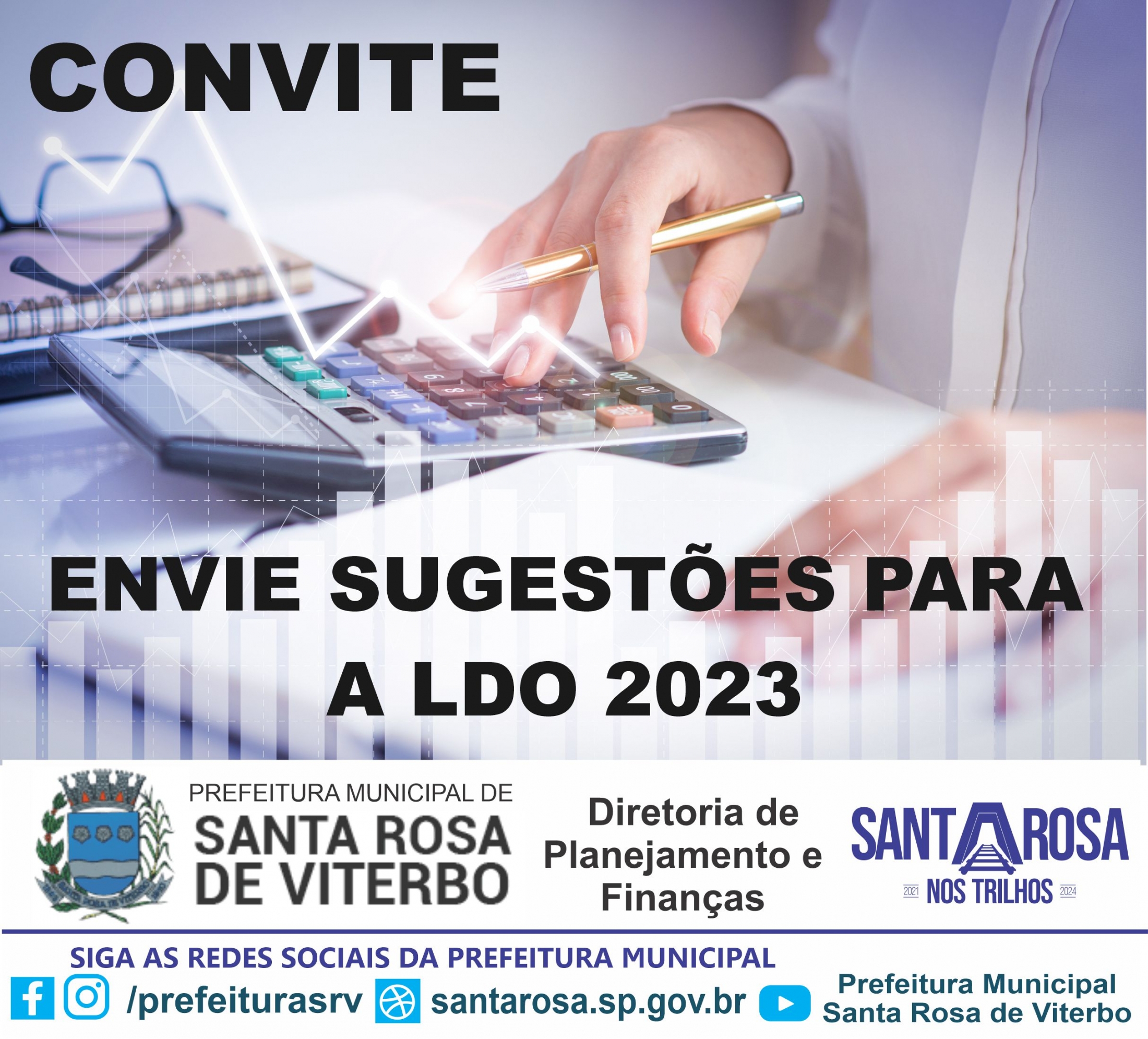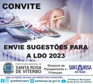 - A Diretoria de Planejamento e Finanças da Prefeitura de Santa Rosa de Viterbo, informa que a população tem até hoje, dia 31 de agosto, para colaborar com sugestões e propostas para a Lei de Diretrizes Orçamentárias (LDO) 2023.