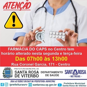 A Prefeitura Municipal de Santa Rosa de Viterbo, através da Diretoria Municipal de Saúde, informa que a Farmácia do CAPS, localizada à Rua Coronel Garcia, 171 - Centro, estará aberta somente no período da manhã nesta segunda (05) e terça-feira (06), das 07h00 às 13h00.