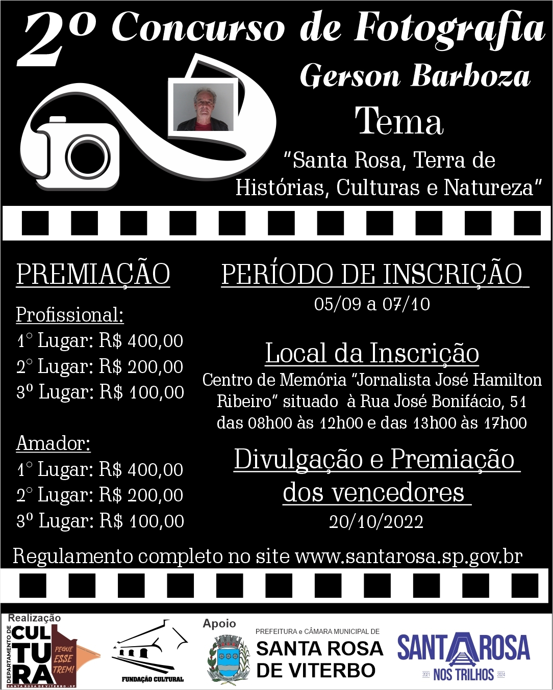 Aberto aos santa-rosenses residentes em Santa Rosa de Viterbo ou não, podem se inscrever a partir de hoje, fotógrafos profissionais e fotógrafos amadores, sendo a premiação dividida pelas categorias: Profissional - 1° Lugar: R$ 400,00 - 2° Lugar: R$ 200,00 – 3º Lugar: R$ 100,00 e Amador - 1° Lugar: R$ 400,00 - 2° Lugar: R$ 200,00 – 3º Lugar: R$ 100,00.