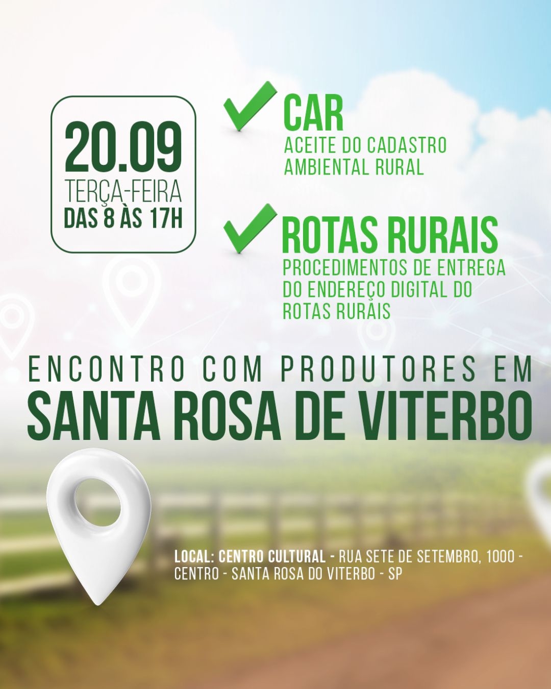 Nesta terça-feira, dia 20 de setembro, a CATI (Coordenadoria de Assistência Técnica Integral) realiza em Santa Rosa de Viterbo um mutirão para adequação e aceite do Cadastro Ambiental Rural (CAR), necessário para adesão ao Projeto de Regularização Ambiental e, também para orientações sobre o Programa Rotas Rurais, que prevê a cobertura e localização dos 296 quilômetros de estradas rurais localizadas no município por meio do Código de Endereçamento Rural Digital (CERD).