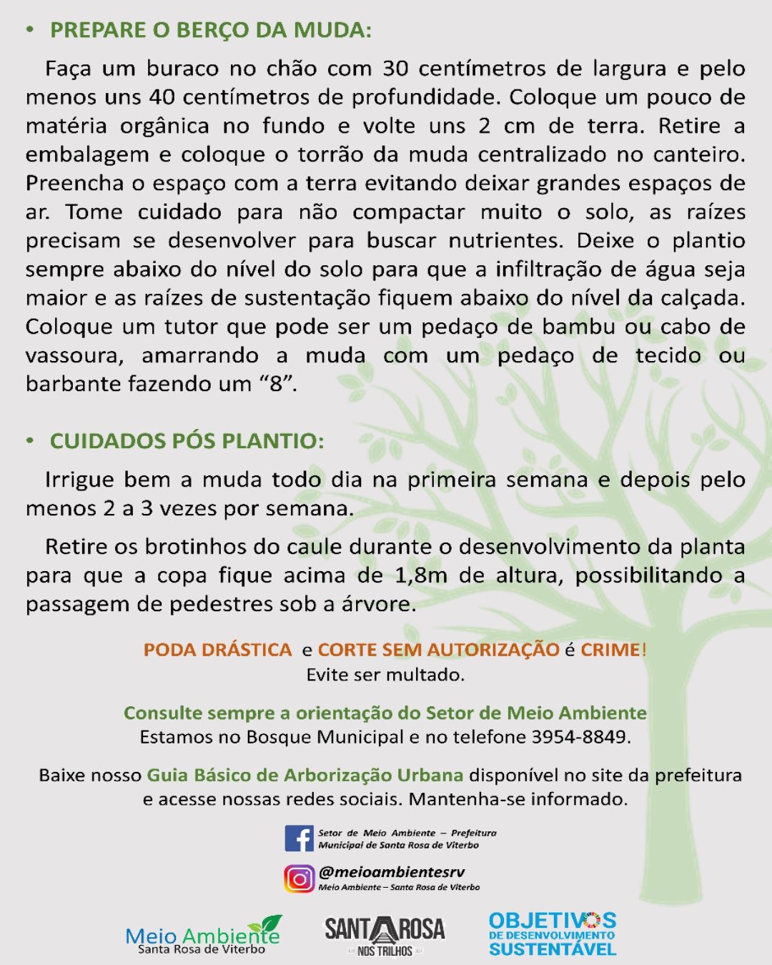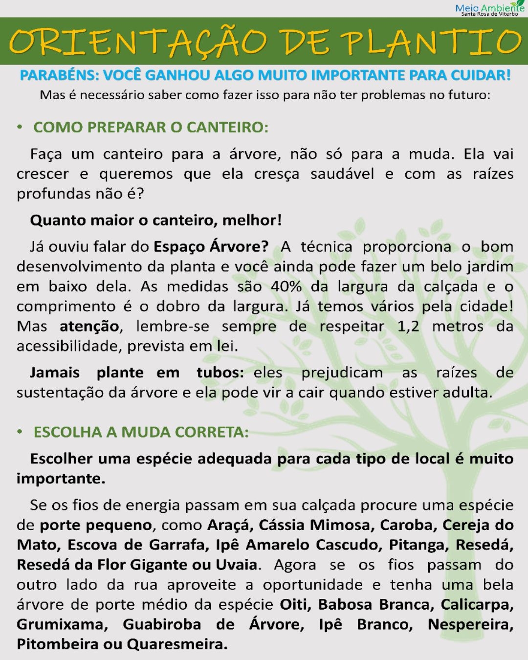 O roteiro explica que qualquer munícipe pode efetuar o plantio observando alguns cuidados básicos como: verificar a proximidade com o meio-fio e a rede elétrica, cavar uma boa cova para a muda e escolher a espécie correta, para não haver transtornos futuros.