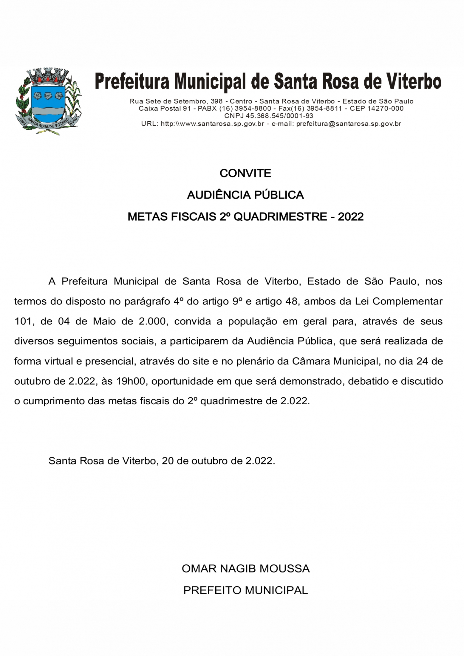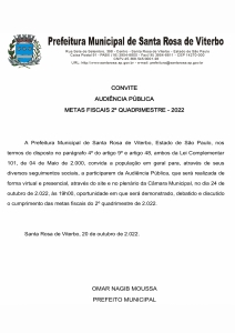 CONVITE PARA AUDIÊNCIA PÚBLICA - METAS FISCAIS 2º QUADRIMESTRE 2022.