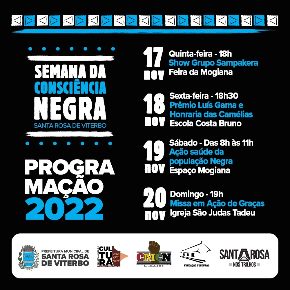 A Prefeitura Municipal, através da Diretoria de Cultura, em parceria com a CMCN, promove mais uma vez a semana de eventos da Consciência Negra. Confira a programação. Todos estão convidados.