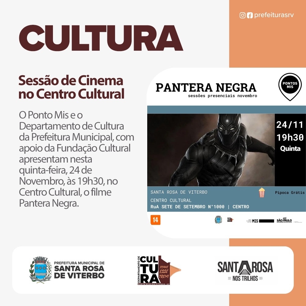 O Ponto Mis e o Departamento de Cultura da Prefeitura Municipal, com apoio da Fundação Cultural e a Câmara Municipal, apresentam nesta quinta-feira, 24 de novembro, às 19h30, no Centro Cultural, o filme Pantera Negra, uma produção da Marvel Studios que traz uma história de um super-herói que comanda o reino de Wakanda.