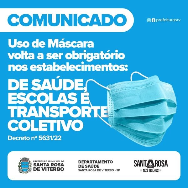 Por conta do aumento dos casos de Coronavírus no município, que até sexta-feira, 25, somava 61 registros neste mês de novembro, a Prefeitura Municipal publicou no início da tarde de hoje, o Decreto nº 5631/22, que tornou obrigatório o uso de máscaras de proteção facial em locais destinados à prestação de serviços de saúde como hospitais, ambulatórios, clínicas, consultórios, pronto socorro, farmácias e afins. Os meios de transporte coletivo de passageiros e as instituições de ensino públicas e privadas, também devem voltar a exigir a proteção.