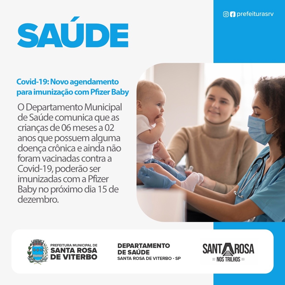 O Departamento Municipal de Saúde comunica que as crianças de 06 meses a 02 anos que possuem alguma doença crônica e ainda não foram vacinadas contra a Covid-19, poderão ser imunizadas com a Pfizer Baby no próximo dia 15 de dezembro.
