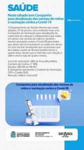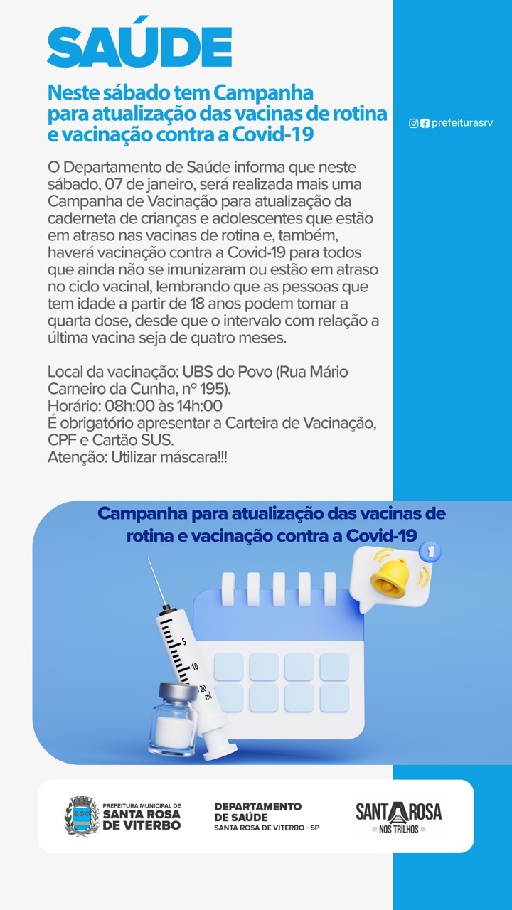 O Departamento de Saúde informa que neste sábado, 07 de janeiro, será realizada mais uma Campanha de Vacinação para atualização da caderneta de crianças e adolescentes que estão em atraso nas vacinas de rotina e, também, haverá vacinação contra a Covid-19 para todos que ainda não se imunizaram ou estão em atraso no ciclo vacinal, lembrando que as pessoas que tem idade a partir de 18 anos podem tomar a quarta dose, desde que o intervalo com relação a última vacina seja de quatro meses.