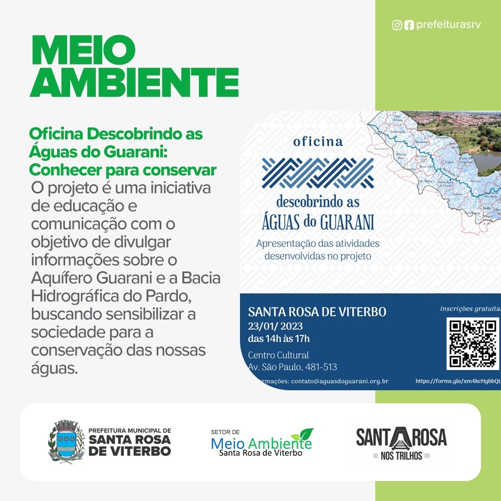 O Departamento de Meio Ambiente promove no dia 23 de janeiro, em Santa Rosa de Viterbo, a Oficina Descobrindo as Águas do Guarani. O projeto é uma iniciativa de educação e comunicação com o objetivo de divulgar informações sobre o Aquífero Guarani e a Bacia Hidrográfica do Pardo, buscando sensibilizar a sociedade para a conservação das nossas águas.