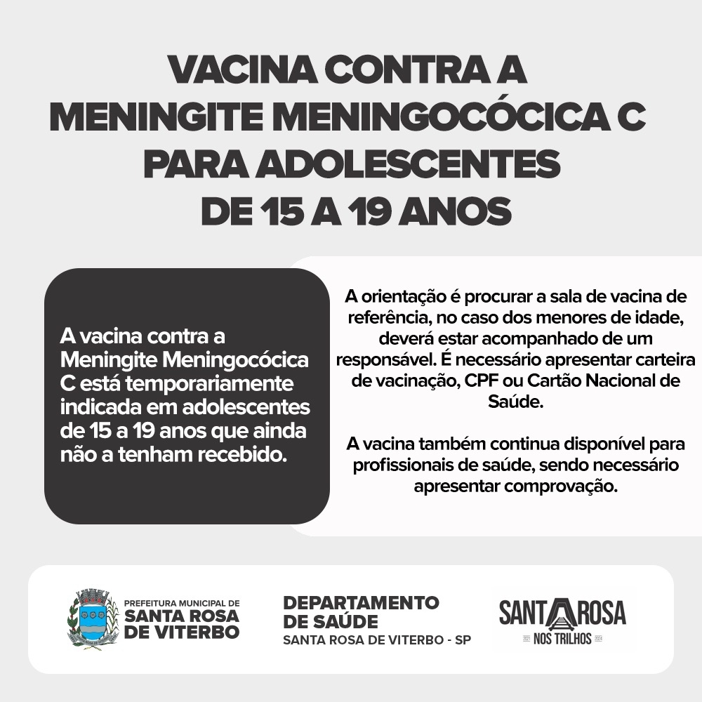 A vacina contra a Meningite Meningocócica C está temporariamente indicada em adolescentes de 15 a 19 anos que ainda não a tenham recebido.