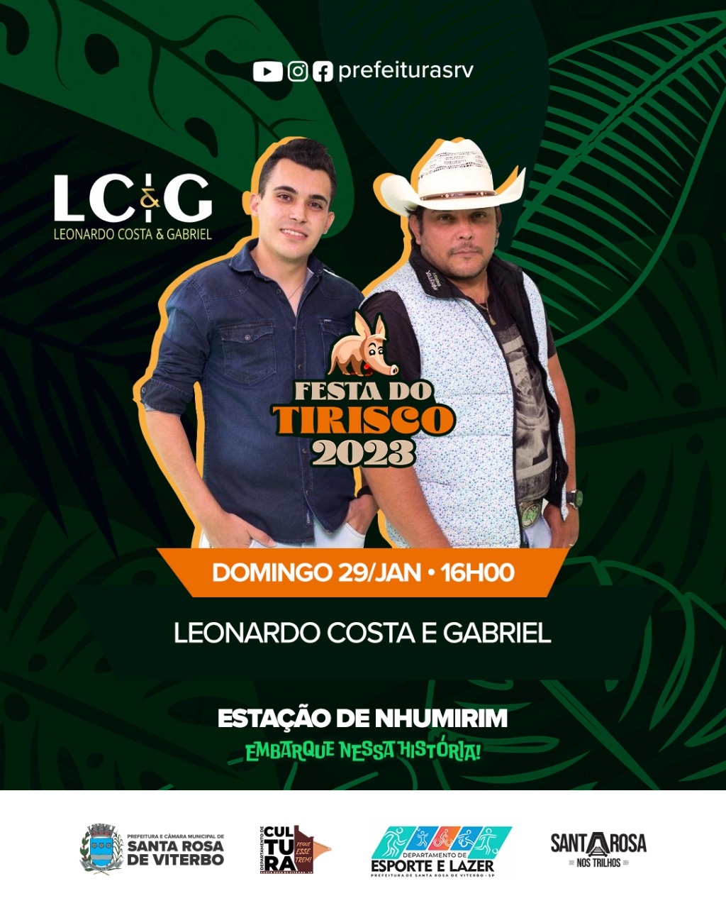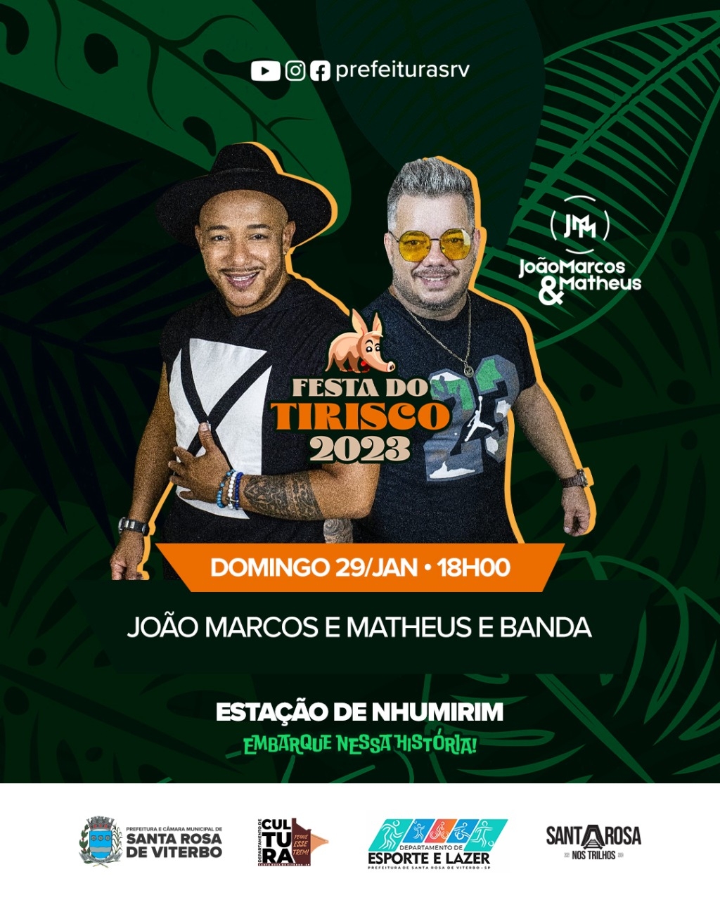 Encerrando a Festa do Tirisco tem show com João Marcos e Matheus e Banda. Com estilo moderno e divertido de fazer música sem perder a essência, a dupla está no mercado há mais de 19 anos e, de lá para cá, segue deixando sua marca e destacando-se por onde passa. Donos dos Hits “Amor de são Paulo, Deu certo, Quero ter você, Vamos pra lá beber” sempre surpreendem, com destaque para seus timbres únicos e talento indiscutível.