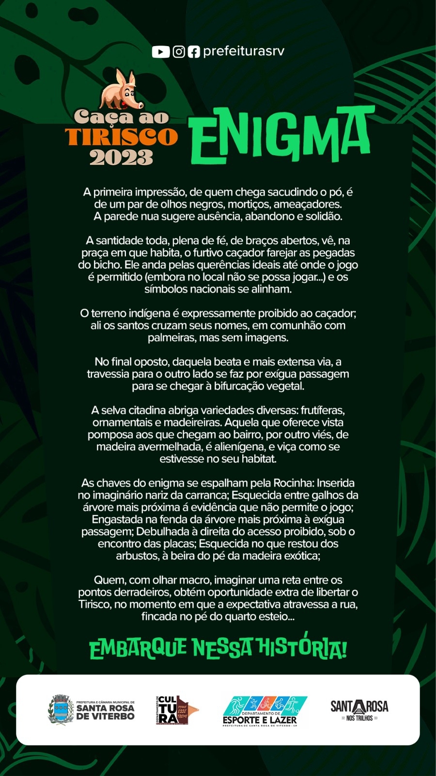 A Caça ao Tirisco deste ano apresenta uma novidade que a diferencia da edição anterior: depois de decifrar o enigma, que ora publicamos, os participantes devem procurar por – pelo menos - uma chave com que possa abrir o cadeado para libertar o bicho que está preso. São seis as chaves similares escondidas em diversos pontos, dentro dos limites do bairro Nhumirim. Apenas uma delas abre a gaiola. Todas estão identificadas com chaveiros padronizados, alusivos ao evento. Assim que encontrar uma chave, o caçador deve apresentá-la à direção da festa, durante o desenrolar da mesma.