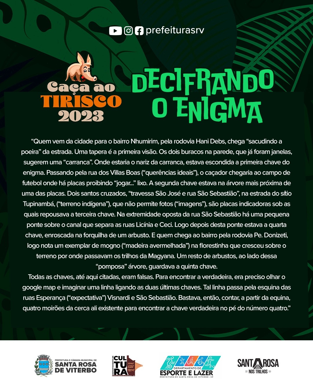 Veja o Enigma decifrado da 2ª Caça do Tirisco: Moradora de Nhumirim ganhou os R$ 500,00 por encontrar a chave que libertou o bicho engaiolado