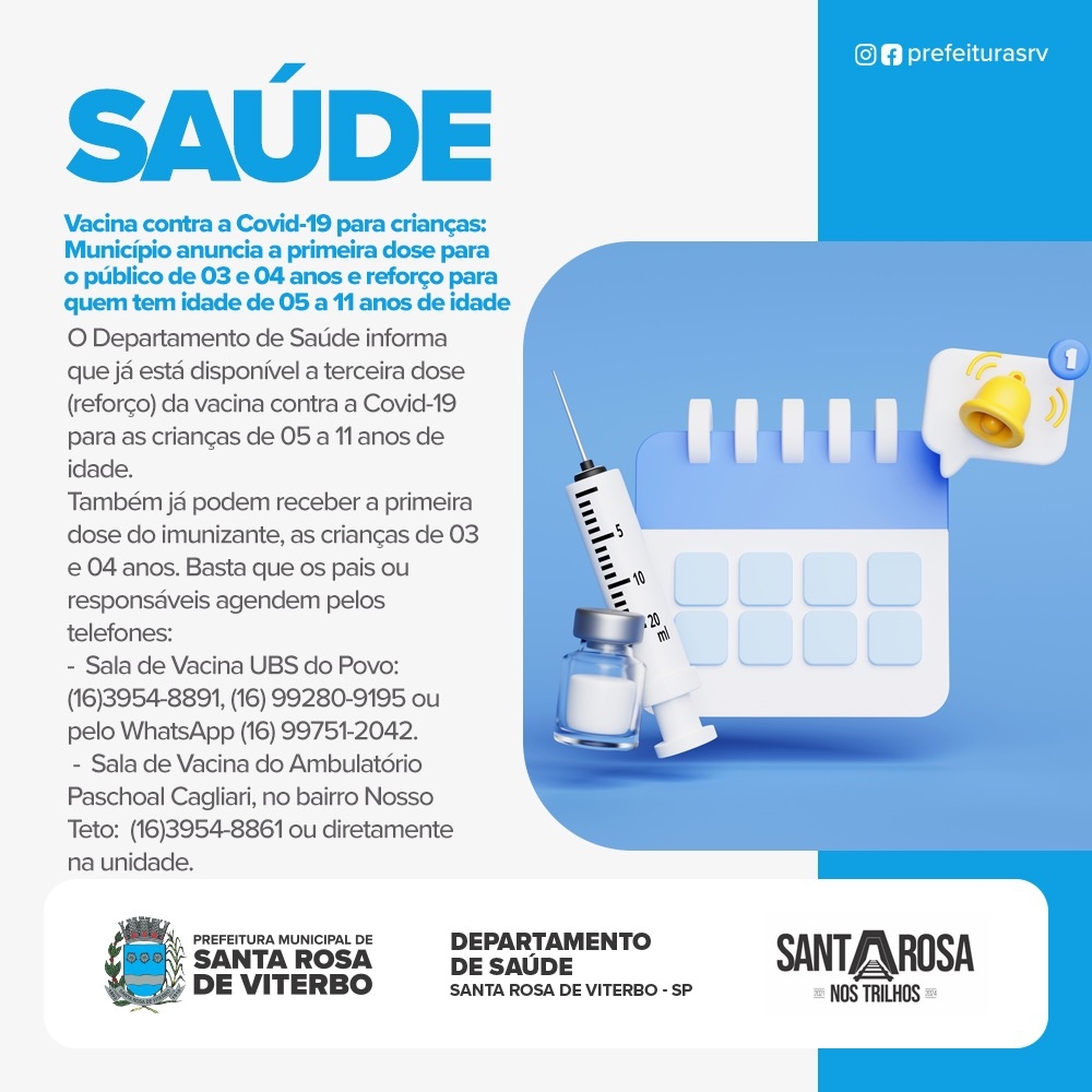 O Departamento de Saúde informa que já está disponível a terceira dose (reforço) da vacina contra a Covid-19 para as crianças de 05 a 11 anos de idade.