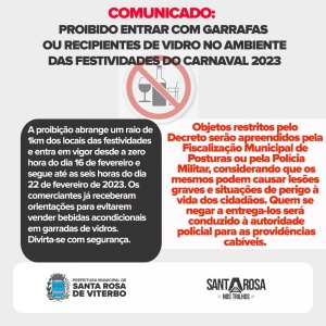 A proibição abrange um raio de 1km dos locais das festividades e entra em vigor desde a zero hora do dia 16 de fevereiro e segue até as seis horas do dia 22 de fevereiro de 2023. Os comerciantes já receberam orientações para evitarem vender bebidas acondicionais em garradas de vidros.
