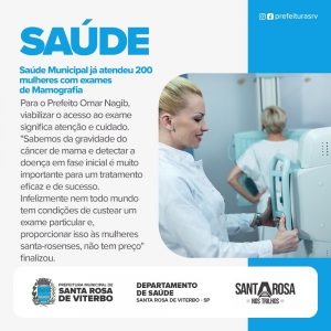 Desde o ano passado, quando o Sistema Único de Saúde (SUS) passou a priorizar o exame da mamografia somente em mulheres dos 50 aos 69 anos, para atender aquelas que não estão no chamado “grupo de risco” ou no “critério de seleção”, a Prefeitura de Santa Rosa de Viterbo, por meio do Departamento de Saúde, optou por contratar os procedimentos com recursos próprios para atender as pacientes das outras faixas etárias, desde que tenham indicação ou encaminhamento médico.