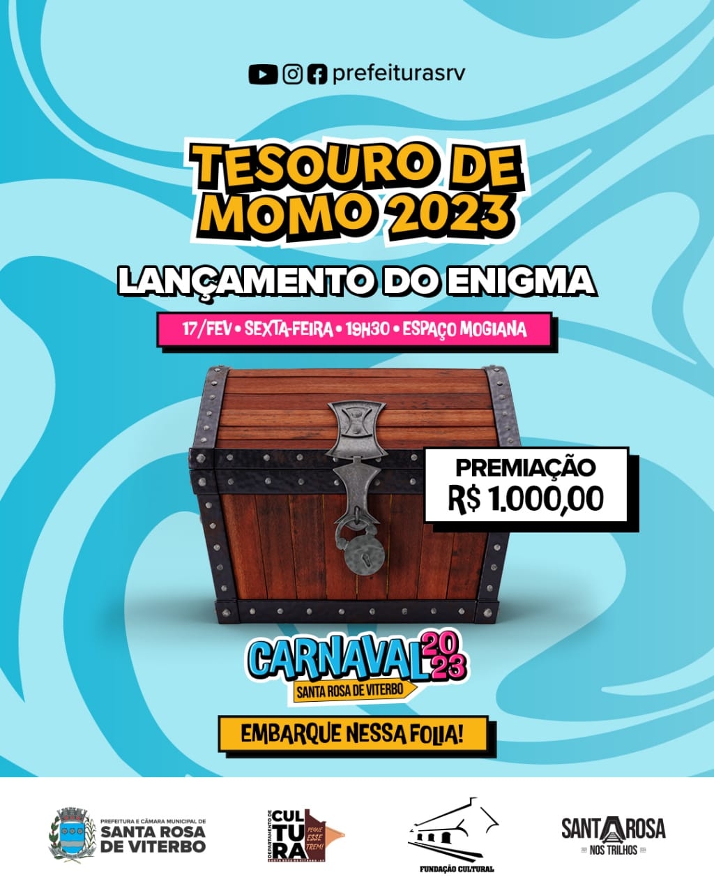 Acompanhe mídias sociais da Prefeitura Municipal para acessar o enigma e se manter informado (a) sobre a Caça ao Tesouro durante o Carnaval 2023.